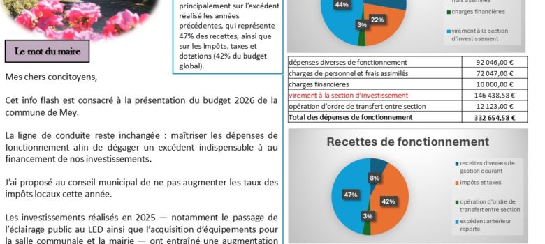Le conseil Municipal de Mey se réunira en mairie Le mercredi 8 avril 2026 à 19h00 L’ordre du jour est le suivant : POINT N°1 : Approbation du procès-verbal de la séance du 11 mars 2026 POINT N°2 : Désignation d’un représentant à l’AGURAM POINT N°3 : Désignation d’un correspondant…